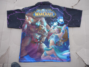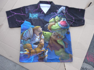 The bottom of the shirt reads Blizzard Entertainment and also has the artist’s signature. Justin Thavirat was a World of Warcraft (2004) lead artist and credited as an artist in StarCraft (1998), Diablo (1996), and Warcraft II: Tides of Darkness (1995) and their collective expansions. Justin also got a special thanks credit in the South Park (TV Series) Episode: Make Love, Not Warcraft (2006).