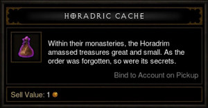 Lorath sells a Greater Horadric Cache which contains a random loot when opened.
